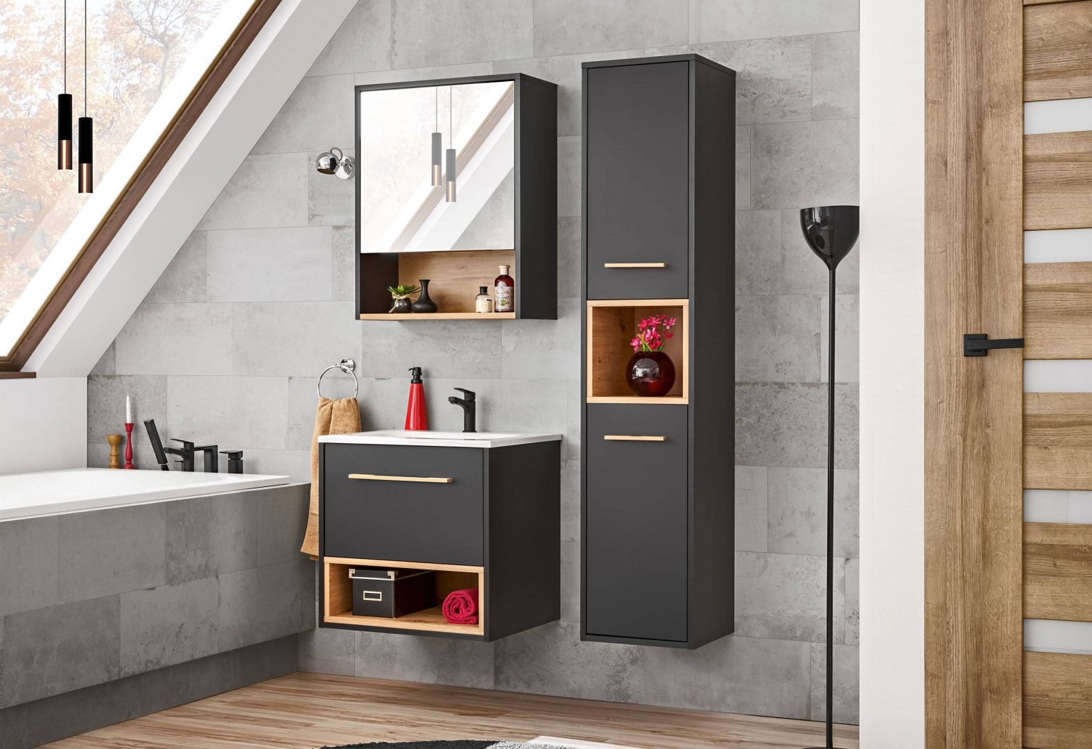 Kolekce Bornea je sada moderního a funkčního koupelnového nábytku, která perfektně kombinuje tmavě šedé korpusy s dřevěnými doplňky v odstínu Dub Artisan. Sestava obsahuje různé velikosti umyvadlových skříněk. Součástí série je také vysoká skříňka a zrcadlové skříňky ve velikostech kompatibilních se skříňkami pod umyvadla. Dveře a zásuvky jsou vybaveny systémem tlumeného zavírání a dřevěnými úchyty. Bornea je kolekce koupelnového nábytku s jedinečným designem a dokonale sladěnými barvami. Dvířka univerzální, možnost zvolit pravé nebo levé.