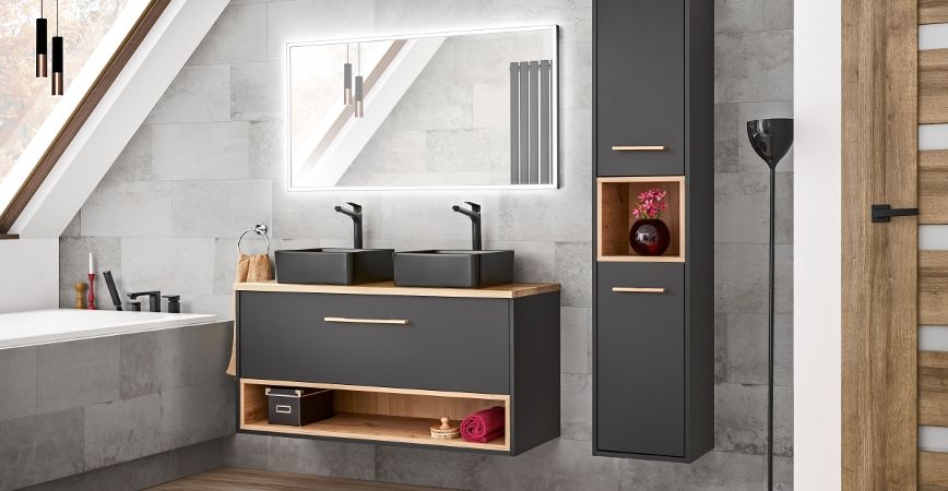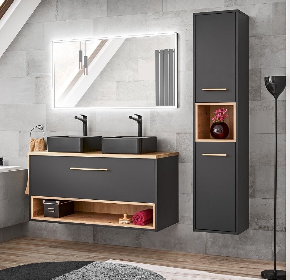 Kolekce Bornea je sada moderního a funkčního koupelnového nábytku, která perfektně kombinuje tmavě šedé korpusy s dřevěnými doplňky v odstínu Dub Artisan. Sestava obsahuje různé velikosti umyvadlových skříněk. Součástí série je také vysoká skříňka a zrcadlové skříňky ve velikostech kompatibilních se skříňkami pod umyvadla. Dveře a zásuvky jsou vybaveny systémem tlumeného zavírání a dřevěnými úchyty. Bornea je kolekce koupelnového nábytku s jedinečným designem a dokonale sladěnými barvami. Dvířka univerzální, možnost zvolit pravé nebo levé.