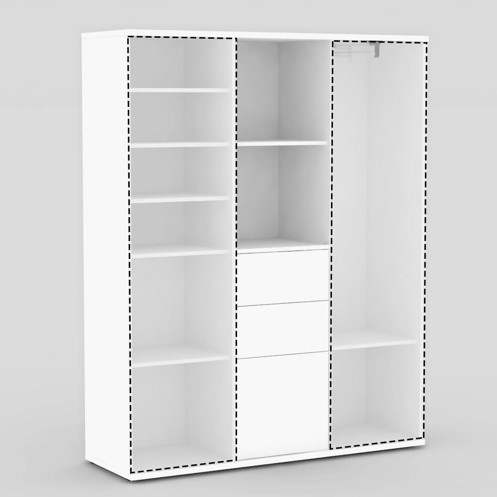 Skříňka má přípravu na 17 polic. V základní výbavě je jedna věšáková tyč, 3 zásuvky a 7 polic, které si můžete umístit dle vlastního výběru.