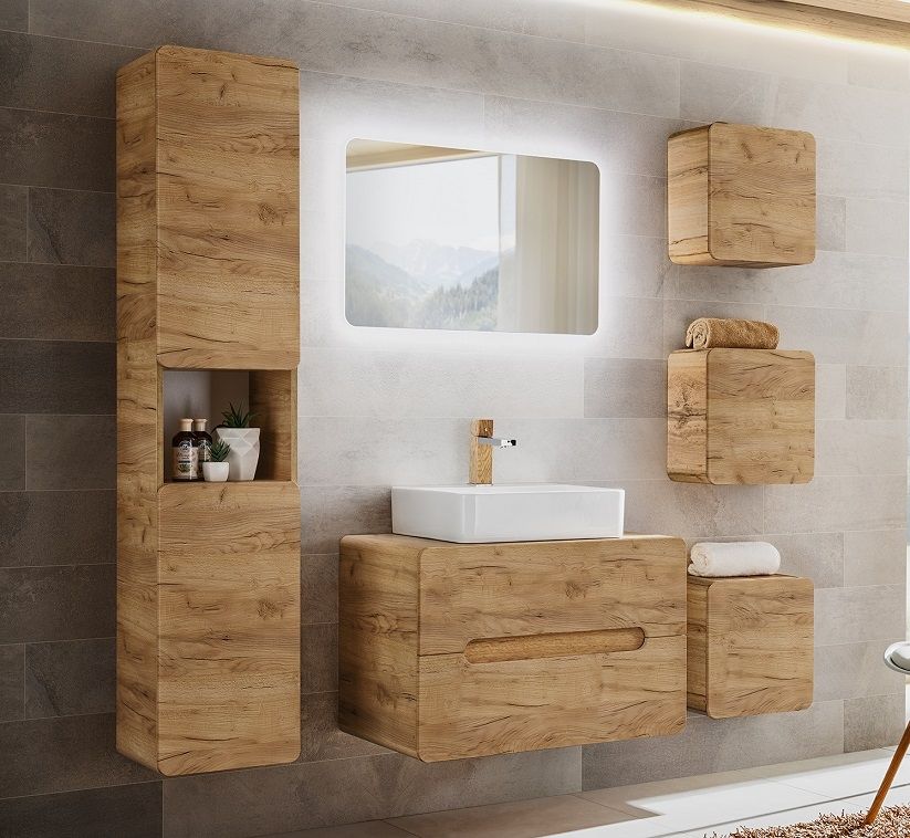 Arusa je neobvyklá sestava koupelnového nábytku, která působí svěžím a moderním designem. Dřevěný korpus v kombinaci s dřevěnými čely skříněk vytváří jemný celek. Zaoblené hrany všech skříní přinášejí sestavu originálního charakteru, lehkost a přední strany bez madel odkazují na nejnovější trendy v interiérovém designu. Kolekce se skládá z nízkých a vysokých skříněk v různých variantách, které vám umožní sestavit individuální a jedinečnou sestavu. Nepochybně zajímavým a velmi módním řešením je skříňka pro umyvadlo. Zrcadlo s LED podsvícením je dokonalým doplňkem sestavy, která dává celé sérii moderní charakter. Sestava Arusa osloví všechny, kteří hledají pozoruhodné a moderní řešení pro svou koupelnu. Dvířka univerzální, možnost zvolit pravé nebo levé.